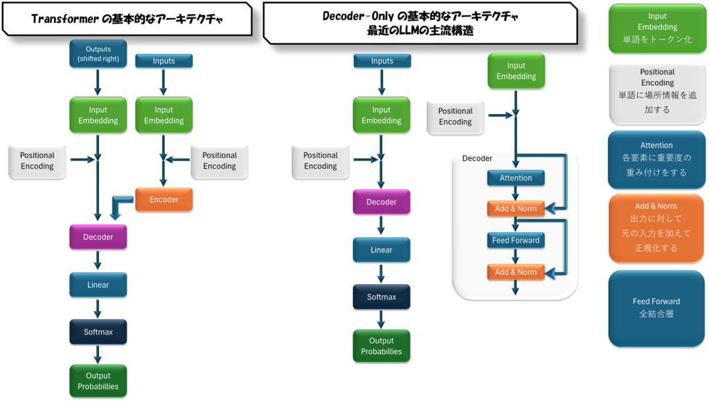 Decoder-Onlyの詳しい説明は省きますが、主に『構造のシンプルさ』『学習コストの低さ』などが採用要因のように思います。他にも要因は色々ありますが、この二つは商業として成り立たせる上で重要なポイントですね。